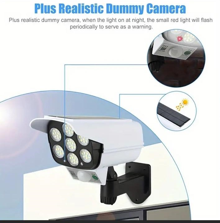 Зовнішній світлодіодний прожектор із підробленим дизайном камери спостереження, прожектор із 77 світлодіодами з дистанційним керуванням, бездротова фіктивна камера безпеки для ґанку, саду та патіо